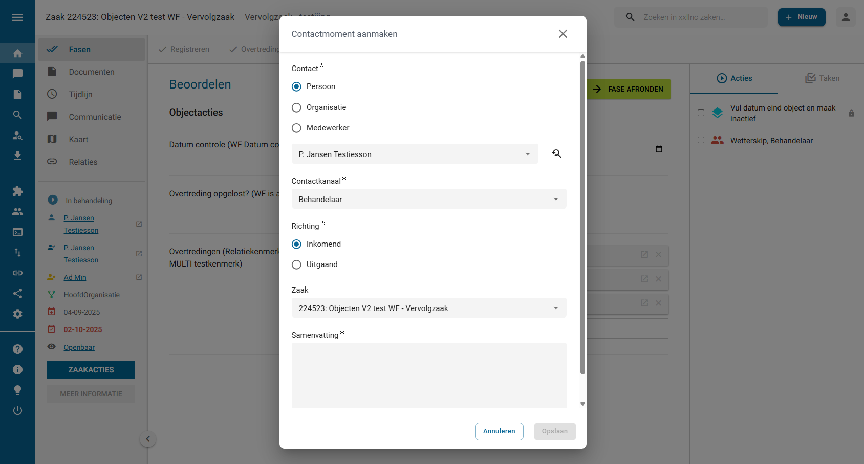 - Wanneer een contactmoment wordt toegevoegd vanuit een zaak zullen bepaalde velden automatisch ingevuld zijn die betrekking hebben op die zaak.