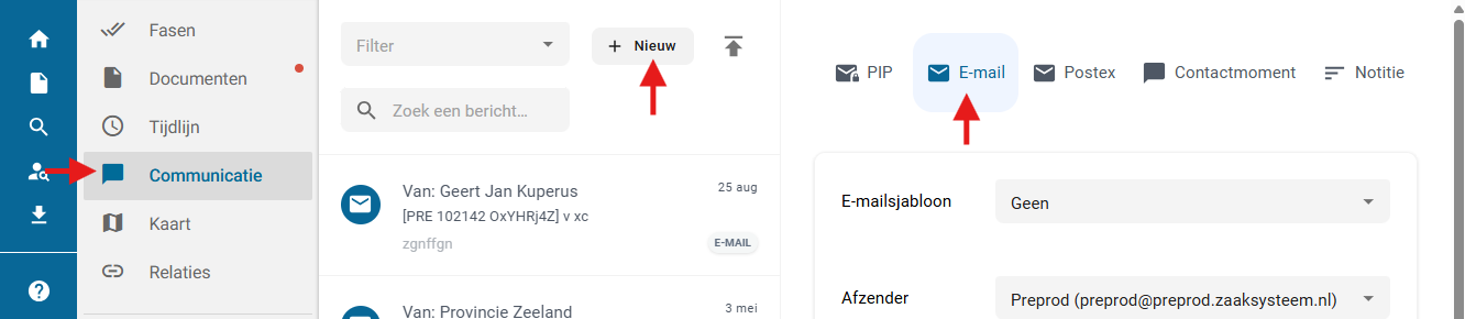 In het communicatietabblad van de zaak vind je alle e-mailberichten die eerder zijn verstuurd of ontvangen binnen deze zaak. Vanuit dit tabblad kun je ook een nieuwe e-mail opstellen.